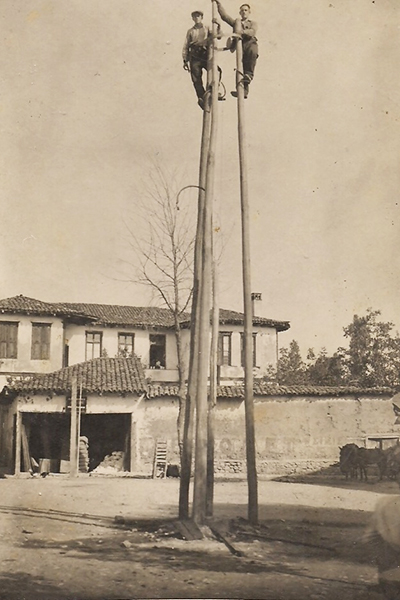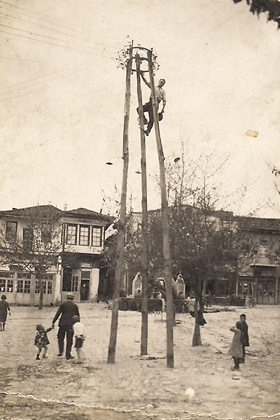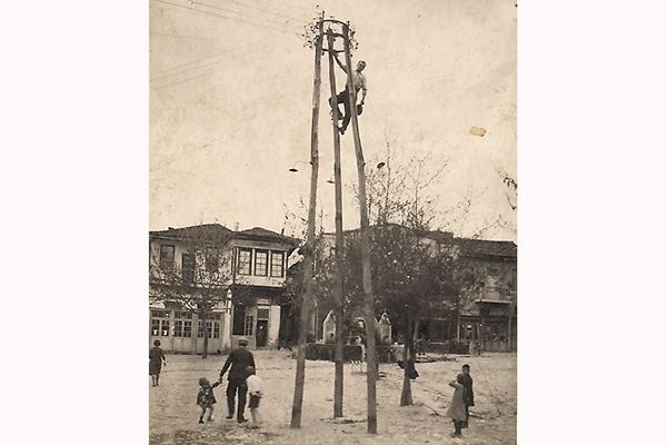 Η κεντρική πλατεία της Γουμένισσας το 1930 και η πλατεία της 23ης Οκτωβρίου, με κάτι περίεργες διαστημικές συνθέσεις της τότε ΔΕΗ, και κάτι θαρραλέους ακροβάτες εναερίτες πάνω στις κολώνες…