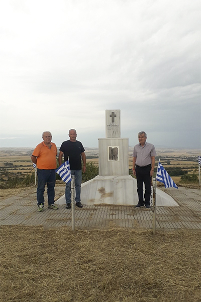 Τη σημαία που αγόρασε ο Σύλλογός μας δεν μπορέσαμε να την τοποθετήσουμε, γιατί με την πολυκαιρία έχει κοπεί το σκοινί. Επισκεπτόμενοι το μνημείο με τον Γενικό Γραμματέα του Συλλόγου μας, Ελευθέριο Ντίνου και τον Εντεταλμένο Σύμβουλο Δημήτρη Φωτιάδη, ο δεύτερος είπε πως θα το ρυθμίσει κι αυτό το θέμα.