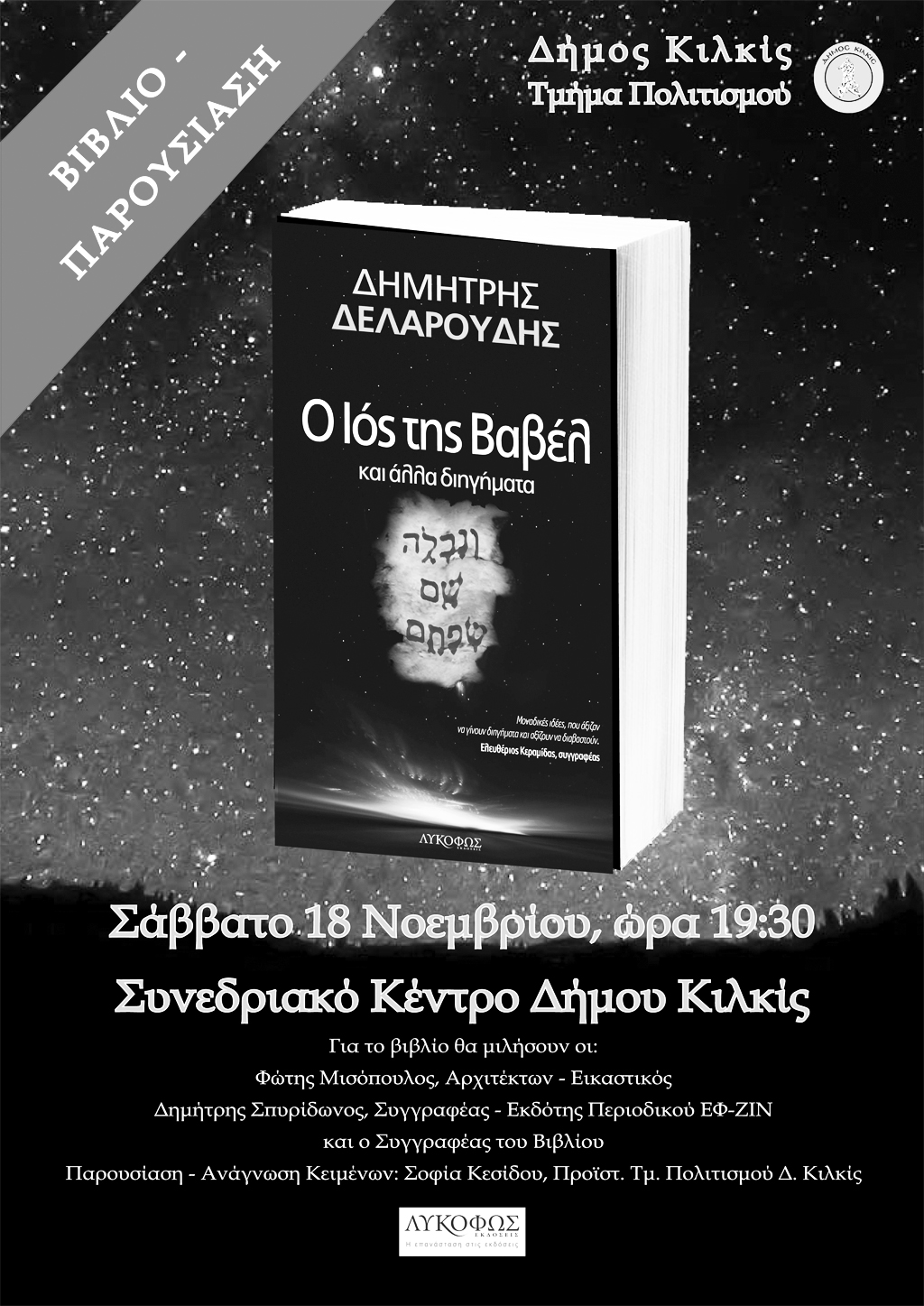 Η Αντιδημαρχία και το Τμήμα Πολιτισμού του Δήμου Κιλκίς σας καλούν να τιμήσετε με την παρουσία σας την παρουσίαση του βιβλίου του Δημήτρη Δελαρούδη με τίτλο “Ο Ιός της Βαβέλ”, το Σάββατο 18 Νοεμβρίου 2017 και ώρα 19.30, στο Συνεδριακό Κέντρο του Δήμου Κιλκίς.