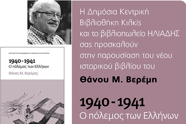 Η Δημόσια Κεντρική Βιβλιοθήκη Κιλκίς, το βιβλιοπωλείο Ηλιάδης και οι εκδόσεις Μεταίχμιο σας προσκαλούν στην παρουσίαση του νέου ιστορικού βιβλίου του Θάνου Μ. Βερέμη με τίτλο «1940-1941: ο πόλεμος των Ελλήνων», την Πέμπτη 14 Νοεμβρίου στις 7 μ.μ. στην αίθουσα εκδηλώσεων «Β. Σεργιαννίδη» του Επιμελητηρίου Κιλκίς (Στενημάχου 2).