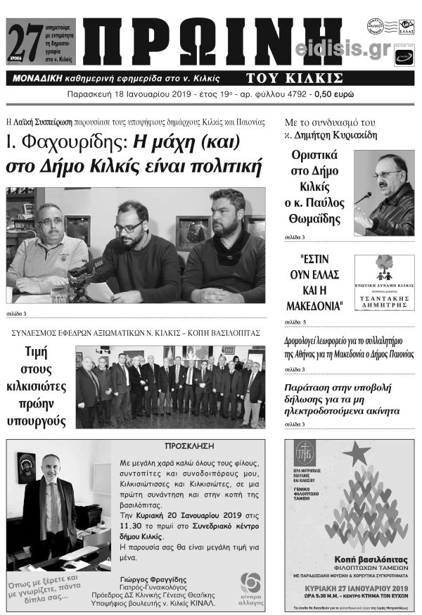 Πέντε χρόνια πριν. Διαβάστε τι έγραφε η καθημερινή εφημερίδα ΠΡΩΙΝΗ του Κιλκίς (18-1-2019)