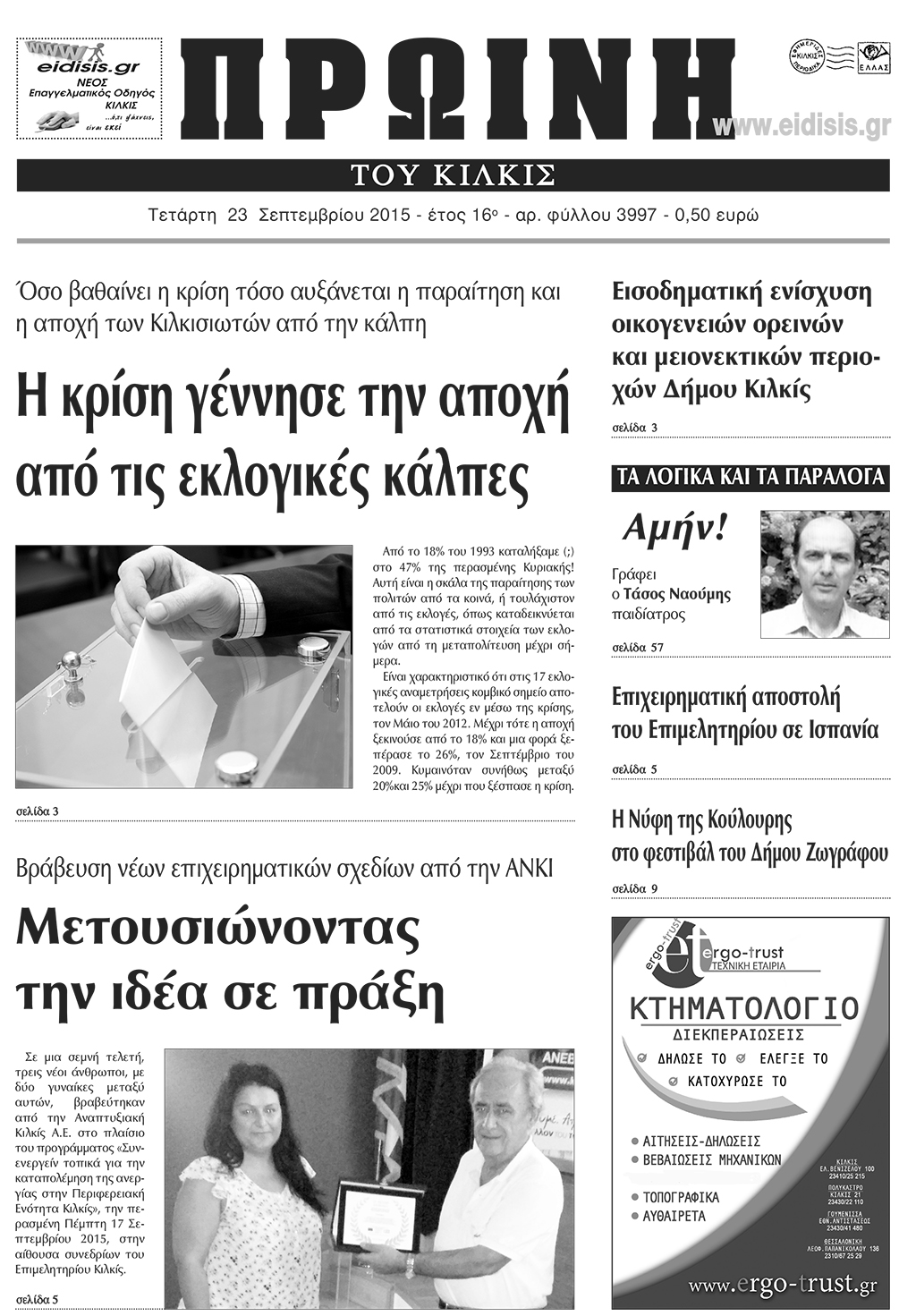 Πέντε χρόνια πριν. Διαβάστε τι έγραφε η καθημερινή εφημερίδα ΠΡΩΙΝΗ του Κιλκίς (23-9-2015)
