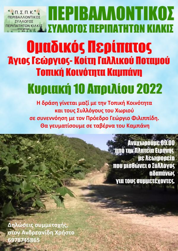 - Κυριακή 10 Απριλίου Εκδρομή στο Καμπάνη με ομαδικό περίπατο από Α. Γεώργιο και την κοίτη του Γαλλικού Ποταμού.