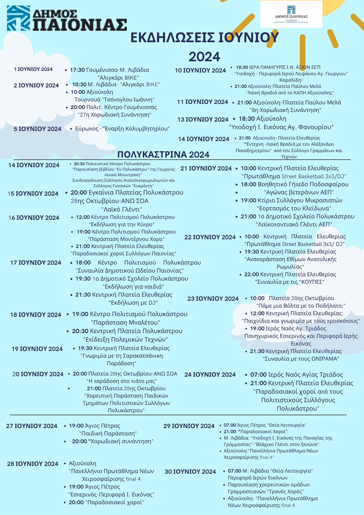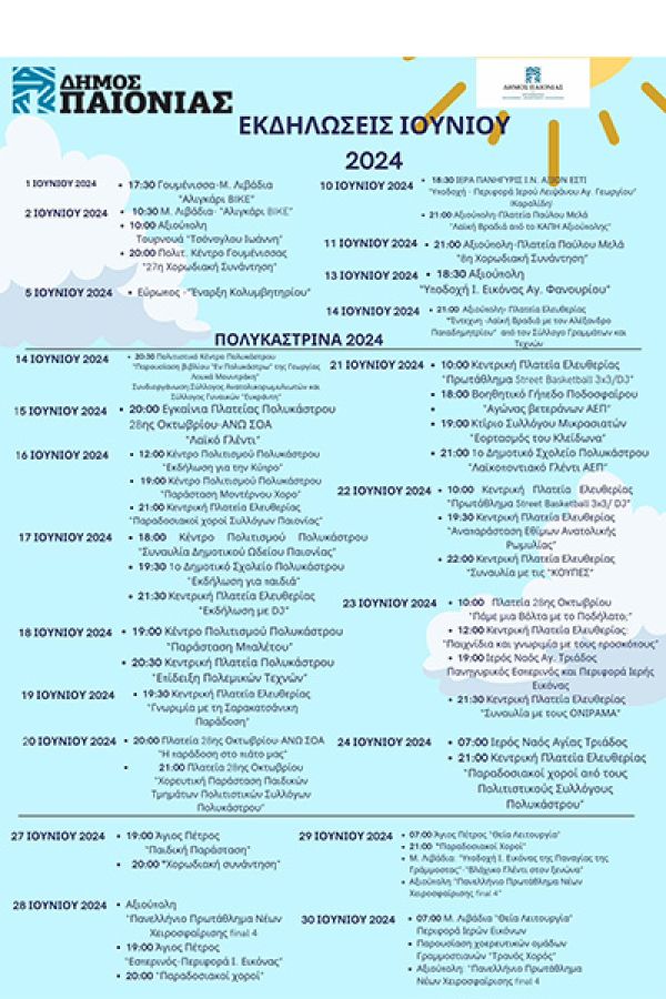 Πρόγραμμα εκδηλώσεων Ιουνίου 2024 του Δήμου Παιονίας