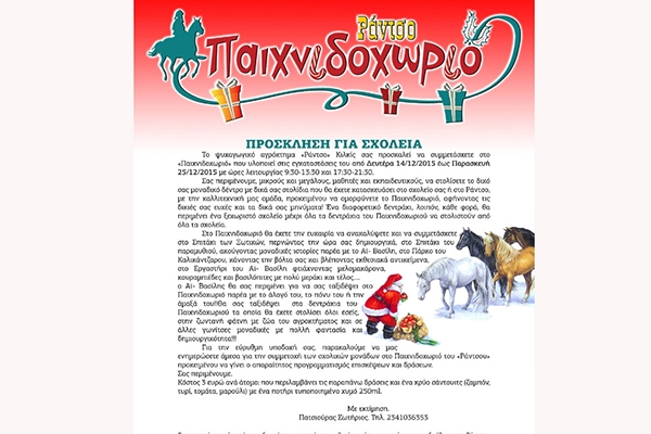 Με αφήγηση παραμυθιού, χριστουγεννιάτικα κάλαντα και τραγούδια κάνουμε γελαστές τις γιορτές και δημιουργούμε χαρούμενη συντροφιά με όσους μας ακολουθήσουν, στην επίσημη έναρξη των εκδηλώσεων για το «Χριστουγεννιάτικο Παιχνιδοχωριό» που διοργανώνει για 1η χρονιά το Ράντσο Κιλκίς, τη Δευτέρα 14 Δεκεμβρίου 2015, στις 18.00 στις εγκαταστάσεις του (5ο χλμ Κιλκίς-Θεσσαλονίκη).