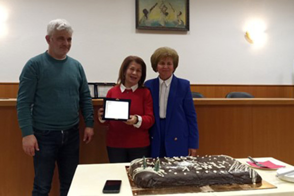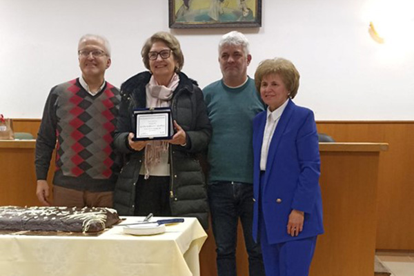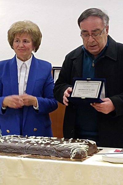 Ο μαέστρος Γιάννης Ζγούρας απένειμε τιμητική πλακέτα στον Δημήτρη Αραμπατζή, για την πολύχρονη τήρηση των οικονομικών της χορωδίας, την οποία παρέλαβε η σύζυγός του κ Ρούλα Αραμπατζή, ταμίας του συλλόγου.