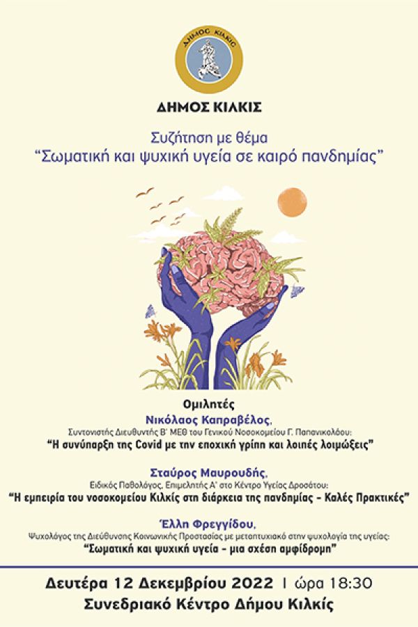 Καλές πρακτικές που εφαρμόστηκαν σε τοπικό επίπεδο κατά τη διάρκεια της πανδημίας και οι συνέπειές της στην ψυχική υγεία είναι συμπληρωματικές παράμετροι που θα εξεταστούν στη συζήτηση με θέμα ‘’Σωματική και ψυχική υγεία σε καιρό πανδημίας” που θα πραγματοποιηθεί τη Δευτέρα 12 Δεκεμβρίου στις 18:30 στο Συνεδριακό Κέντρο του Δήμου Κιλκίς.