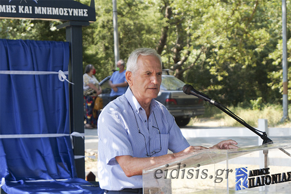 Ο δήμαρχος Παιονίας στον σύντομο χαιρετισμό που απηύθυνε ευχαρίστησε τον κ. Νίκο Σιάνα και την εθελοντική ομάδα, για την ευγενική τους χορηγία (μνημείο, εκκλησάκι, παγκάκια και επιμέλεια χώρου), εξαίροντας τις ιδιαίτερες ευαισθησίες που τους χαρακτηρίζουν σε θέματα που αφορούν την ιστορική μνήμη, τον πολιτισμό και το περιβάλλον.