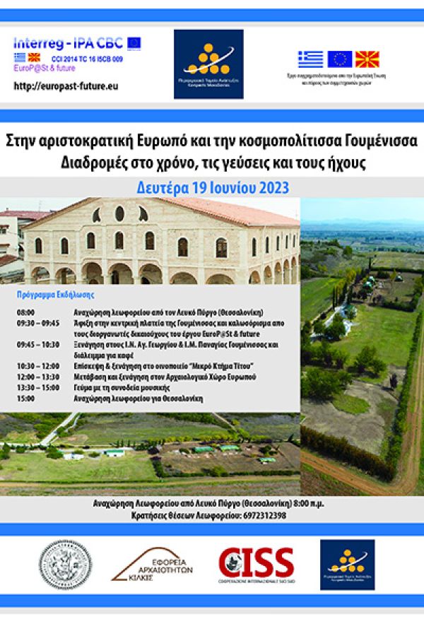Η εκδήλωση περιλαμβάνει καλωσόρισμα των συμμετεχόντων και σύντομη παρουσίαση του έργου «EuroP@St &; future», στην Κρήνη του Α΄ Παγκοσμίου Πολέμου, που βρίσκεται στην κεντρική πλατεία της Γουμένισσας. Ακολουθεί ξενάγηση στους Ιερούς Ναούς Κοίμησης της Θεοτόκου και Αγίου Γεωργίου στη Γουμένισσα, Κιλκίς. Στη συνέχεια θα πραγματοποιηθεί σύντομο διάλειμμα για καφέ και επίσκεψη στο οινοποιείο «Μικρό Κτήμα Τίτου» για ξενάγηση και οινογνωσία. Η εκδήλωση ολοκληρώνεται με μετάβαση στον Αρχαιολογικό χώρο της Ευρωπού, όπου θα πραγματοποιηθεί ξενάγηση και θα ακολουθήσει γεύμα με τη συνοδεία μουσικής.