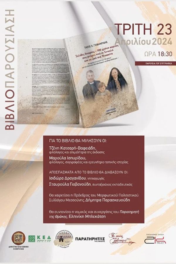 Η Δημοτική Βιβλιοθήκη Κομοτηνής, στο πλαίσιο των δράσεων που υλοποιούνται με την ΚΟΙΝΣΕΠ «Κομοτηνή εν Δράσει», ο Μορφωτικός Πολιτιστικός Σύλλογος Μεσσούνης και οι εκδόσεις Παρατηρητής της Θράκης, σας προσκαλούν στην παρουσίαση του βιβλίου του Τάσου Γιοβανούδη «Σελίδες Ιστορίας- 100 χρόνια πορείας στις μνήμες από το Σιναπλή και τη ζωή στη Μεσσούνη», με αφορμή την επέτειο των 100 χρόνων από την εθελούσια ελληνοβουλγαρική ανταλλαγή πληθυσμών», που θα πραγματοποιηθεί παρουσία του συγγραφέα, την Τρίτη 23 Απριλίου 2024 και ώρα 18.30 στη Δημοτική Βιβλιοθήκη Κομοτηνής.
