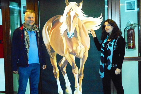 Ασπρόμαυρα άλογα σε θέση μάχης ορθώνουν το παράστημά τους στα προσχέδια, άλογα που η εκφραστική ζωντάνια και τα ζωηρά χρώματα στον καμβά υπογραμμίζει την επιβλητικότητά τους στο χώρο.