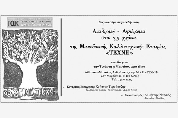 Τα ΓΑΚ – Αρχεία Ν.Κιλκίς οργανώνουν εκδήλωση για τα τριάντα πέντε χρόνια δράσης και προσφοράς της Μακεδονικής Καλλιτεχνικής Εταιρίας «ΤΕΧΝΗ» του Κιλκίς, που θα πραγματοποιηθεί την Τετάρτη 9 Μαρτίου 2016 και ώρα 18:30 μμ στην αίθουσα «Μανόλης Ανδρόνικος» της Μ.Κ.Ε. ΄ΤΕΧΝΗ’ (25Ης Μαρτίου 20, 61100 Κιλκίς).