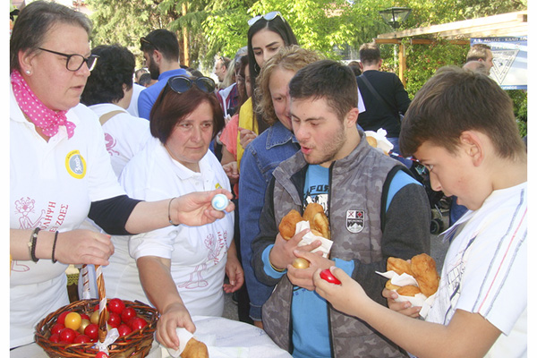 Τα κόκκινα αυγά, προσφορά της εταιρίας ΑΥΓΟΔΙΑΤΡΟΦΙΚΗ, που τσούγκριζαν με το Χριστός Ανέστη, χαροποιούσαν μικρούς και μεγάλους, οι οποίοι τα δέχονταν ευχαρίστως παρόλο που τα χέρια τους ήταν γεμάτα με τα υπό δοκιμή ΠΙΡΟΣΚΙ.