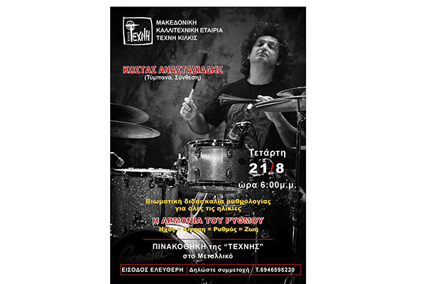 Ελάτε λοιπόν να απολαύσετε μια βιωματική διδασκαλία ρυθμολογίας, ένα master class με τον διεθνούς φήμης ντράμερ, τον Κιλκισιώτη μουσικό, την Τετάρτη 21 Αυγούστου 2019 και ώρα 6 το απόγευμα έως τις 8 το βράδυ στην Πινακοθήκη της Τέχνης.