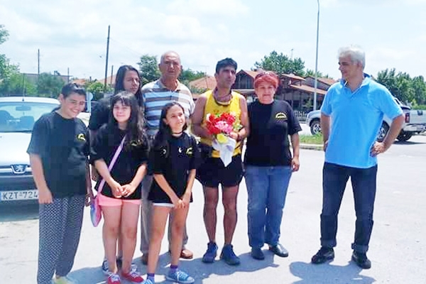 Ο πολιτιστικός σύλλογος Δροσάτου υποδέχεται στην είσοδο του χωριού μαζί με τον πρόεδρο της τοπικής κοινότητας Νίκο Τερζενίδη και τον αντιδήμαρχο Δοιράνης Γιάννη Σισμανίδη τον Πόντιο Υπερμαραθωνοδρόμο Γιώργο Ζαχαριάδη.