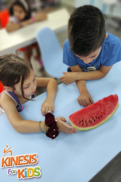 Οι μικροί κηπουροί του ΚΔΑΠ Kinesis, την ώρα της κηπουρικής, αποφάσισαν να ασχοληθούν με τον πρωταγωνιστή των φρούτων του καλοκαιριού, που δεν είναι άλλος από το καρπούζι. Πρώτα ενημερώθηκαν για την καλλιέργεια και συγκομιδή του φρούτου κι έπειτα για τον τρόπο με τον οποίο μπορούμε να καταλάβουμε αν το καρπούζι που διαλέξαμε είναι το σωστό ή το λάθος. Τέλος, περιεργαστήκαμε ένα κομμάτι καρπούζι και το εσωτερικό του. Ενθουσιασμένοι με την επιλογή μας, ανυπομονούσαμε να επιστρέψουμε σπίτι και να γευτούμε λίγο από το δροσερό αυτό φρούτο.