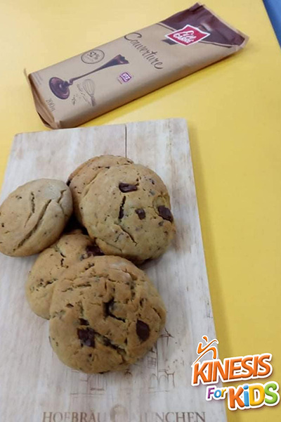 Μία λαχταριστή δημιουργία έψησε ο φούρνος του ΚΔΑΠ Kinesis την ώρα της μαγειρικής! Η λιχουδιά μας αυτήν τη φορά ήταν νηστίσιμα κούκις με κομματάκια μαύρης σοκολάτας. Ανακατέψαμε τα υγρά υλικά μας, προσθέσαμε το αλεύρι και ξεκινήσαμε να πλάθουμε στρόγγυλα μπισκοτάκια. Τα στοιχίσαμε στο ταψί και τα ψήσαμε. Σύντομα η δομή μας μοσχομύρισε και οι κοιλίτσες μας φάνηκαν ικανοποιημένες!