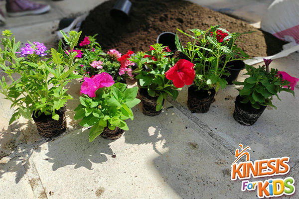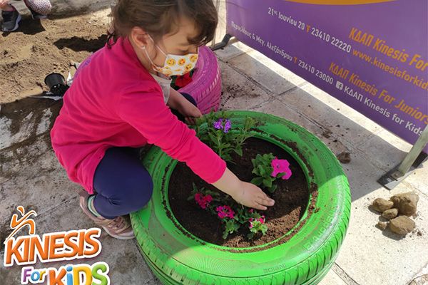 Μία ανοιξιάτικη νότα προσθέσαμε στην αυλή του ΚΔΑΠ Kinesis, καθώς φυτέψαμε πολύχρωμα λουλούδια. Δύο παλιές ρόδες ήταν η βάση της γλάστρας μας. Χρωματίσαμε τη μία ρόδα ροζ και την άλλη λαχανί, τις γεμίσαμε με χώμα και οι έμπειροι πλέον κηπουροί μας άνοιξαν με τα χεράκια τους λακκουβίτσες, τοποθέτησαν με πολύ προσοχή τα λουλούδια, κάλυψαν με χώμα, το πάτησαν και η γωνιά μας έτοιμη! Ποτίσαμε με λίγο νερό και υποσχεθήκαμε ότι όλοι μαζί θα φροντίζουμε τα όμορφα λουλούδια μας.