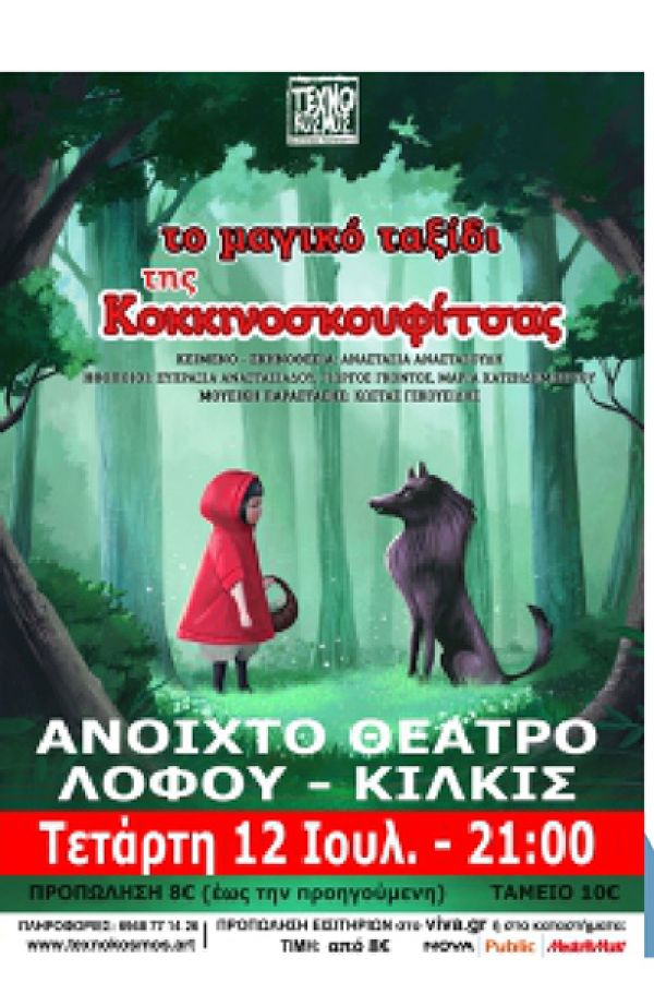 Οι θεατρικές παραγωγές ‘’Τεχνόκοσμος’’ ανεβάζουν αύριο Τετάρτη 12 Ιουλίου στο Θέατρο Λόφου Αγίου Γεωργίου Κιλκίς την παιδική θεατρική παράσταση ‘’Το μαγικό ταξίδι της Κοκκινοσκουφίτσας’’