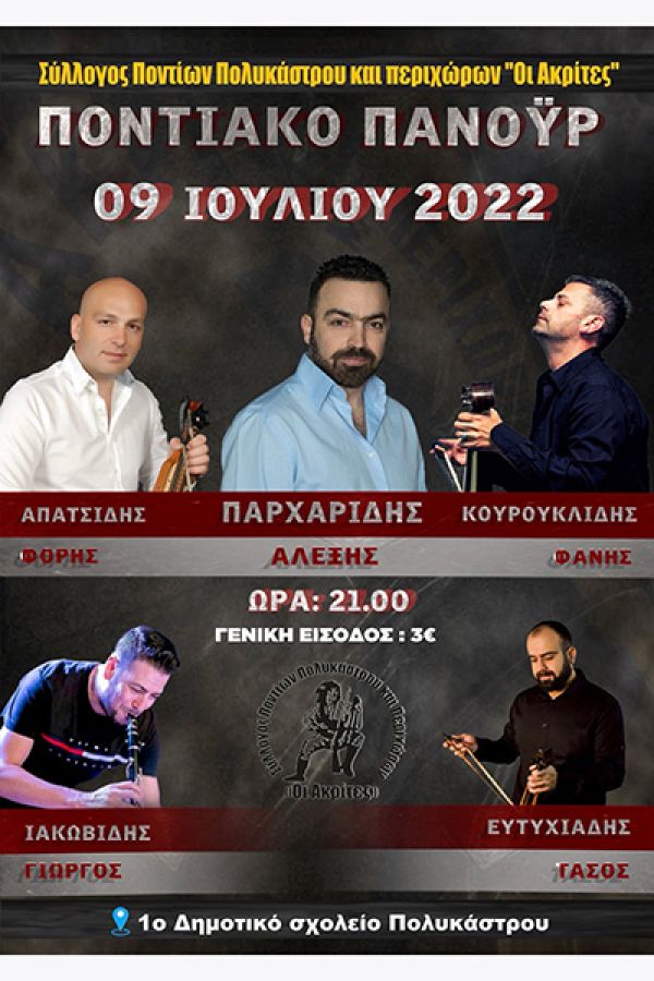 Τη βραδιά θα ντύσουν μουσικά οι : Αλέξης Παρχαρίδης- τραγούδι, Φάνης Κουρουκλίδης-λύρα, Φόρης Απατσίδης λύρα-τραγούδι, Γιώργος Ιακωβίδης κλαρίνο και Τάσος Ευτυχιάδης λύρα-τραγούδι.
