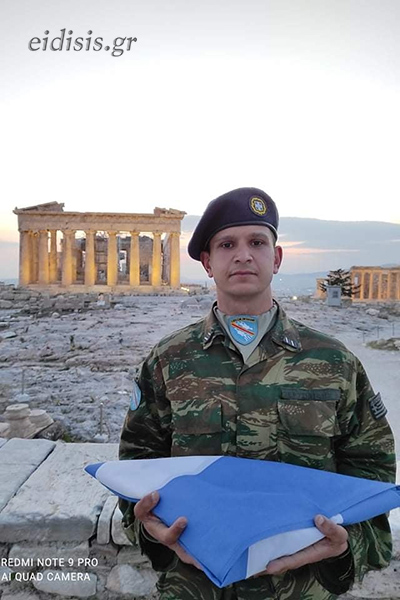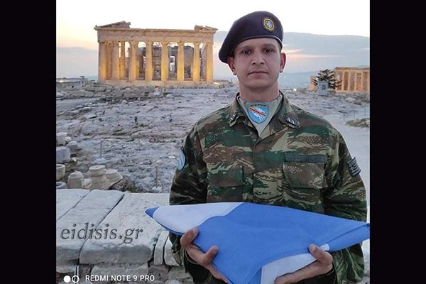 Είναι ο νεαρός στρατιώτης, Δημήτρης Περτσινίδης, από το Δροσάτο Κιλκίς, την ώρα της έπαρσης της ελληνικής σημαίας στην Ακρόπολη. Αισθάνεται δέος αλλά και περηφάνια γι’ αυτό που κάνει καθημερινά, το πρωί να υψώνει τη σημαία και με τη δύση του ήλιου να την υποστέλλει, με τη γαλανόλευκη να κυματίζει όλη μέρα, περήφανη κι αυτή για την Ελλάδα, την Ιστορία και τον Πολιτισμό της, κληρονομιά σε όλη την Ανθρωπότητα.