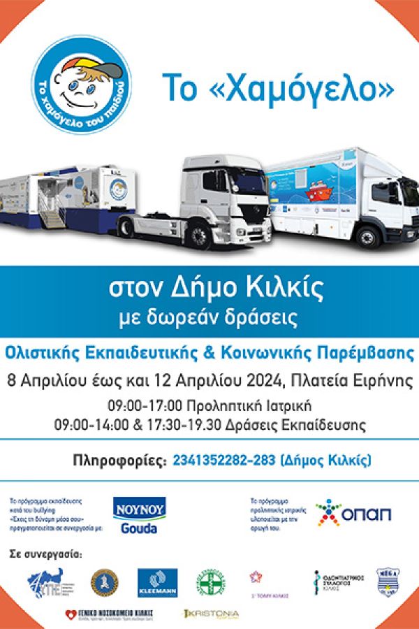 Από τη Δευτέρα 8 έως και την Παρασκευή 12 Απριλίου‘’Το Χαμόγελο του Παιδιού’’ θα βρίσκεται στο Κιλκίς, για να υλοποιήσει δωρεάν ολιστικές δράσεις, για μικρούς και μεγάλους. Οι ολιστικές δράσεις για μαθητές, μαθήτριες, γονείς/κηδεμόνες αλλά και εκπαιδευτικούς του Κιλκίς, περιλαμβάνουν:
