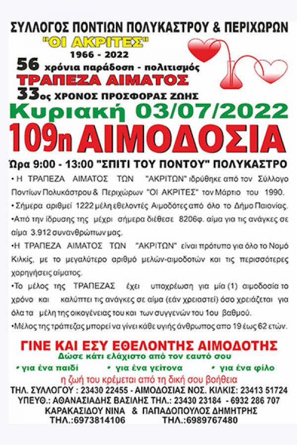 Καλούνται τα μέλη και όσοι επιθυμούν να γίνουν μέλη της "Τράπεζας αίματος" να προσέλθουν και να αιμοδοτήσουν.