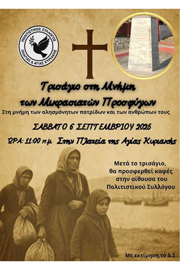Τρισάγιο στη μνήμη των Μικρασιατών Προσφύγων το Σάββατο 6 Σεπτεμβρίου στην πλατεία της Αγ. Κυριακής
