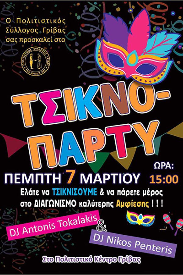 Ελάτε να τσικνίσουμε και να πάρετε μέρος σε διαγωνισμό καλύτερης αμφίεσης την Πέμπτη 7 Μαρτίου στις 15:00 στο Πολιτιστικό Κέντρο Γρίβας.