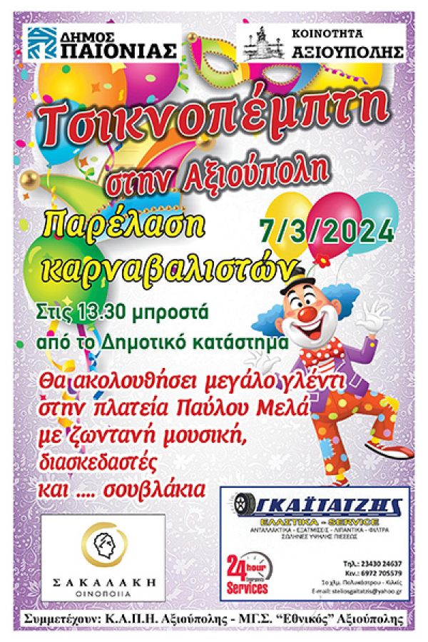 Την τσικνοπέμπτη 7/3  και ώρα 13:30 θα γίνει παρέλαση καρναβαλιστών  μπροστά από το Δημοτικό κατάστημα στην Αξιούπολη και θα ακολουθήσει μεγάλο γλέντι στην πλατεία Παύλου Μελλά με ζωντανή μουσική, πολλούς διασκεδαστές και άφθονα σουβλάκια.