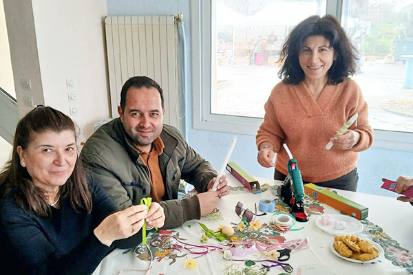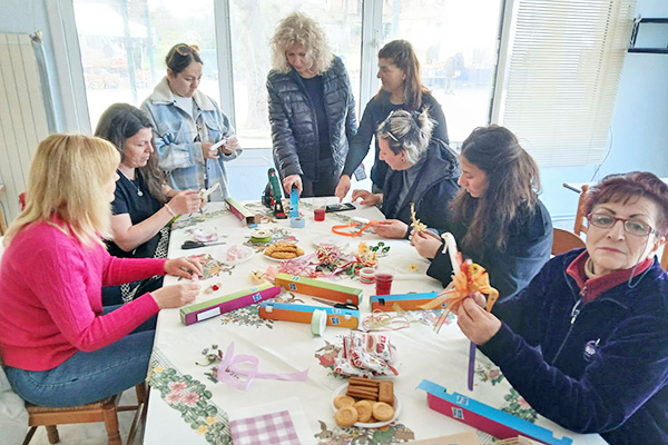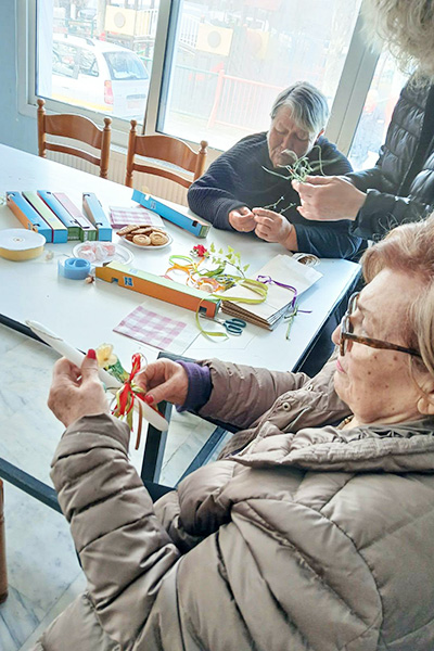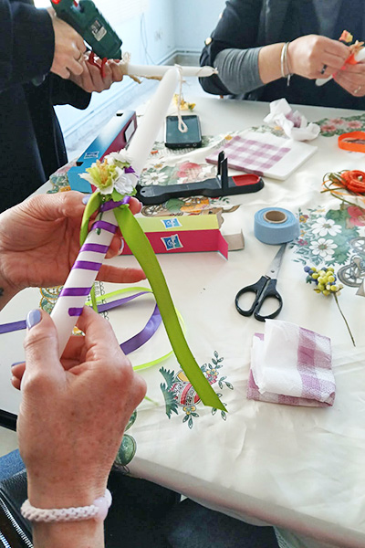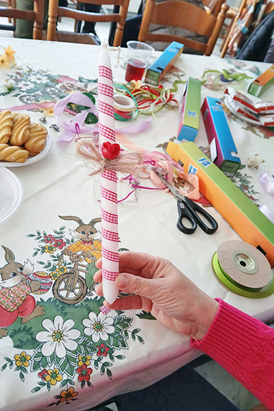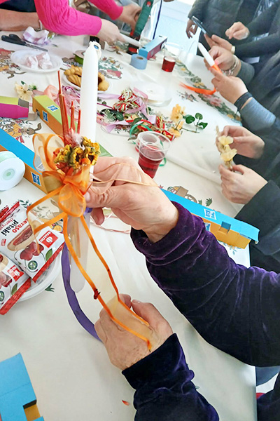 Το κεντρικό τραπέζι μετατράπηκε σε ένα μικρό εργαστήριο, γεμάτο από πολύχρωμες κορδέλες, μικροαντικείμενα, σπάγγους και ψαλίδια χειροτεχνίας, και οι ηλικιωμένες κυρίες, με τη βοήθεια των στελεχών του ‘’Βοήθεια στο Σπίτι’’, στόλισαν τα κεριά με κορδέλες και ταιριαστά για την περίσταση διακοσμητικά.