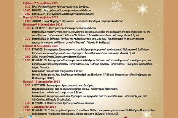 ΓΟΥΜΕΝΙΣΣΑ: Φωταγώγηση Χριστουγεννιάτικου δένδρου, συνοδεία της φιλαρµονικής του δήµου µας και της χορωδίας του Πολιτιστικού Συλλόγου “Οι Παίονες”. Διασκέδαση παιδιών από magic show & DJ set.