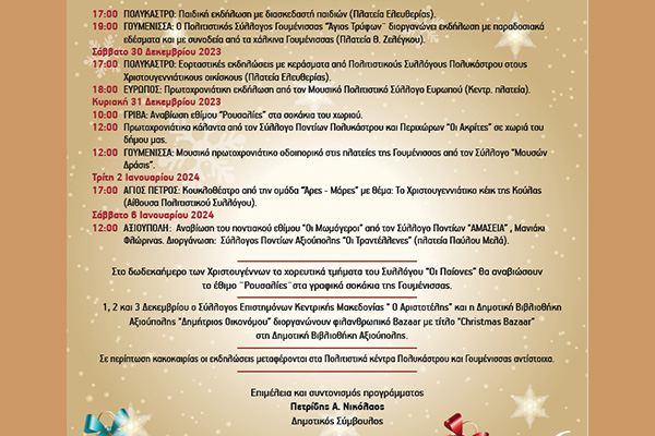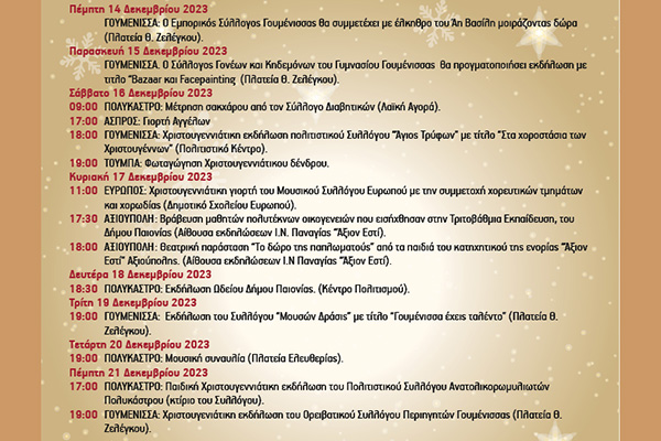 18:00 ΓΟΥΜΕΝΙΣΣΑ: Χριστουγεννιάτικη εκδήλωση από τον Πολιτιστικό Σύλλογο “ΟΙ Παίονες” (Πολιτιστικό Κέντρο).