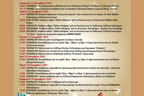 19:30 ΠΟΛΥΚΑΣΤΡΟ: Φωταγώγηση Χριστουγεννιάτικου δένδρου. Κάλαντα από την φιλαρµονική του Δήµου µας, τον Σύλλογο Ανατολικορωµυλιωτών Πολυκάστρου, τον Σύλλογο Ποντίων Πολυκάστρου “Οι Ακρίτες” και το Ωδείο Δήµου Παιονίας.
