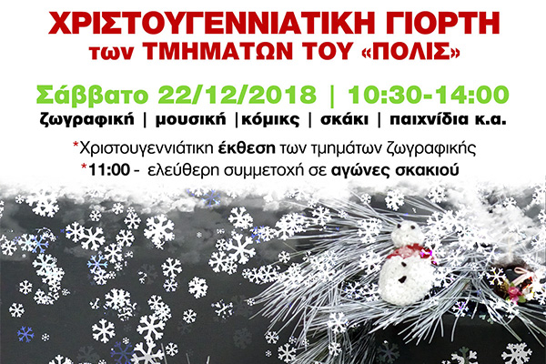 Το Σάββατο 22/12/2018 και ώρες 10:30-14:00 στα εργαστήρια του Καλλιτεχνικού και Πολιτιστικού Συνόλου «η πόλις» αντί μαθημάτων θα γιορτάσουμε τα Χριστούγεννα!