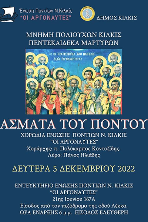 Στην εκδήλωση, η οποία θα γίνει στον 1ο όροφο του κτηρίου του Συλλόγου (οδός 21ης Ιουνίου 167Α, είσοδος από τον πεζόδρομο επί της οδού Λέκκα), το τμήμα χορωδίας της Ένωσης Ποντίων θα παρουσιάσει την μέχρι τώρα δουλειά του υπό την καθοδήγηση του χοράρχη, π. Πολύκαρπου Κοντοζίδη. Στην ποντιακή λύρα, την χορωδία θα συνοδεύσει ο συνεργάτης των «Αργοναυτών», Πάνος Ηλιάδης.
