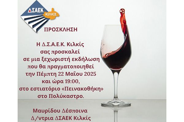 Mε μεγάλη χαρά σας προσκαλούμε στην εκδήλωση Γευσιγνωσίας της Δημόσιας ΣΑΕΚ Κιλκίς που θα πραγματοποιηθεί την Πέμπτη 22 Μαΐου 2025 και ώρα 19.00 στο εστιατόριο ¨Πεινακοθήκη» στο Πολύκαστρο.