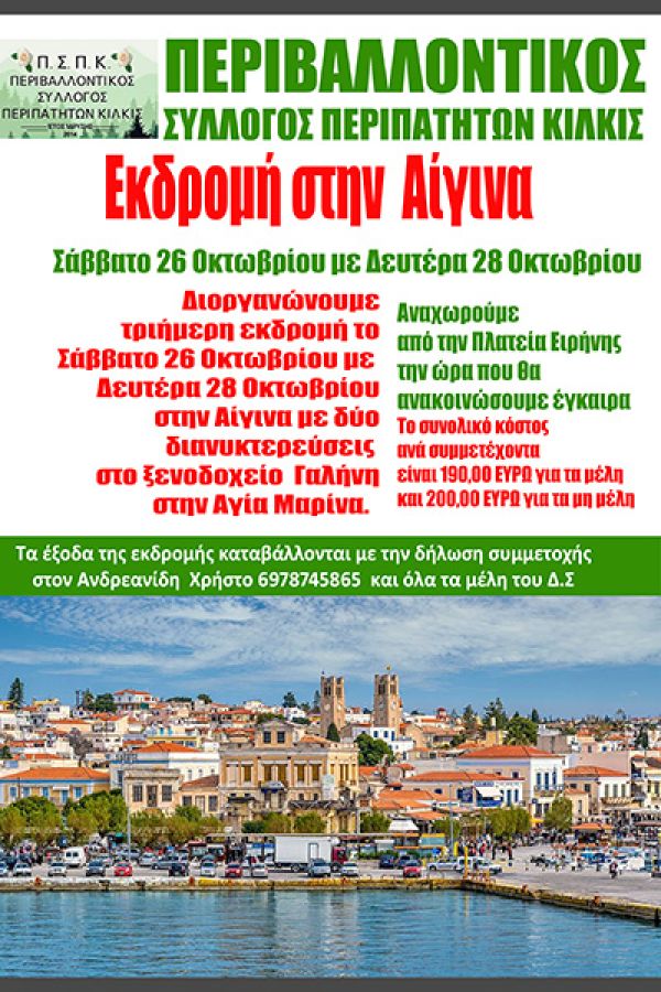 Τριήμερη εκδρομή στην Αίγινα διοργανώνει ο Περιβαλλοντικός Σύλλογος Περιπατητών Κιλκίς το Σάββατο 26 Οκτωβρίου.