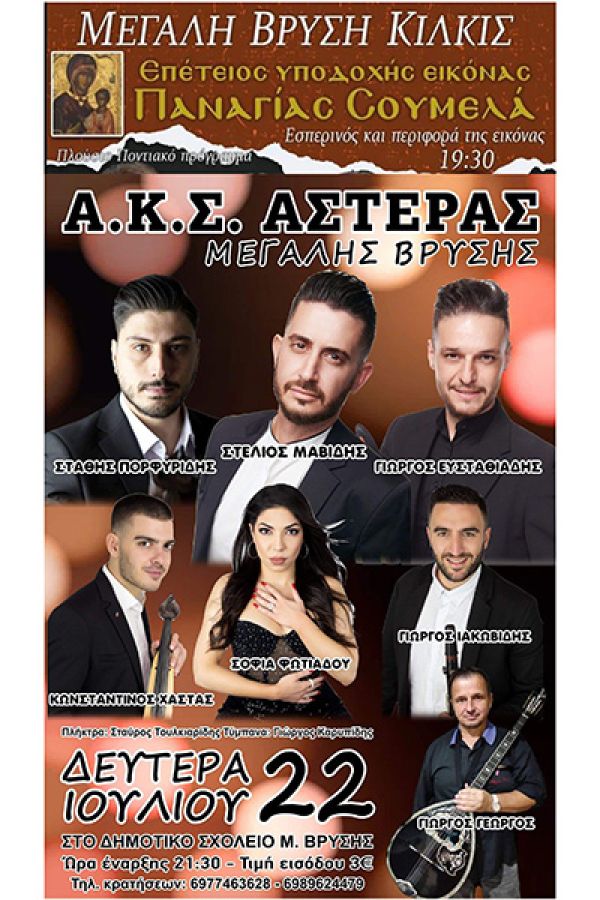 Ο Αθλητικός Σύλλογος Μεγάλης Βρύσης ο ΑΣΤΕΡΑΣ σας προσκαλεί την Δευτέρα 22 Ιουλίου στις 7.30 στον εσπερινό για την Επέτειο της Υποδοχής της Εικόνας της Παναγίας Σουμελάς θα ακολουθήσει περιφορά της εικόνας και ποντιακό γλέντι στις 9.30 στην αυλή του Δημοτικού Σχολείου Μεγάλης Βρύσης.