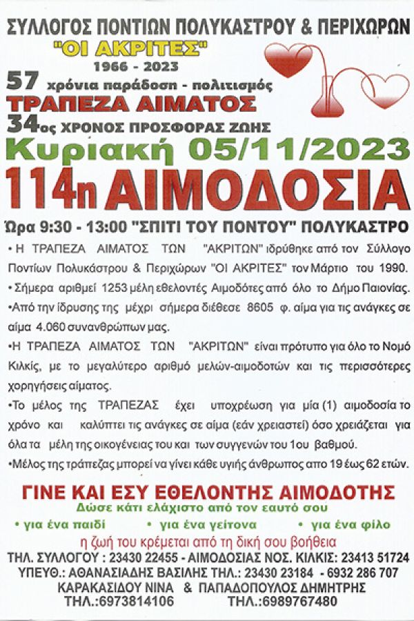 Ολοκληρώνεται ο κύκλος των αιμοδοσιών των μελών της Τράπεζας Αίματος των "Ἁκριτών" Πολυκάστρου, για το έτος 2023, με την 115η Εθελοντική Αιμοδοσία που θα πραγματοποιηθεί για άλλη μια φορά στο "Σπίτι του Πόντου" στο Πολύκαστρο, την Κυριακή 3 Δεκεμβρίου από 09:00 έως 13:00.