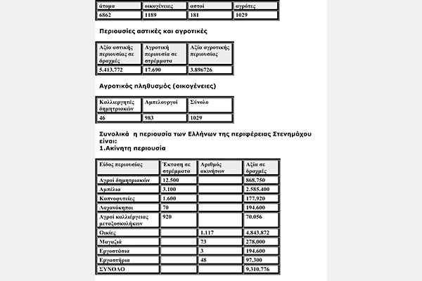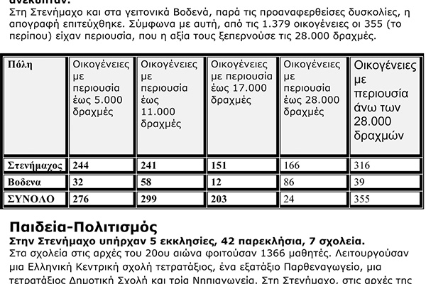 Στη Στενήμαχο και στα γειτονικά Βοδενά, παρά τις προαναφερθείσες δυσκολίες, η απογραφή επιτεύχθηκε. Σύμφωνα με αυτή, από τις 1.379 οικογένειες οι 355 (το περίπου) είχαν περιουσία, που η αξία τους ξεπερνούσε τις 28.000 δραχμές.