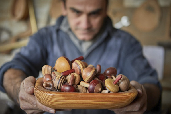 Τη μεγάλη του συλλογή από σβούρες διαρκώς την ανανεώνει, διότι τις περισσότερες απ' αυτές τις δωρίζει σε φίλους και γνωστούς. Όταν θέλει να προσθέσει μια «πινελιά χρώματος δεν τις βάφει, αλλά κόβει σε κυλίνδρους διαφορετικά έγχρωμα ξύλα, τα οποία ενώνει και τα περνά σε μία καβίλια που λειτουργεί ως άξονας, πάνω στον οποίο περιστρέφεται η σβούρα. Ξύλα όπως το κατακόκκινο παντούκ, το καφέ της αμερικάνικης καρυδιάς, το γκρι από την αντίστοιχη ελληνική ποικιλία. Επιλέγει ακόμη τον έβενο, που είναι κατάμαυρος σαν πίσσα, τον ινδονησιακό παλίσανδρο, που είναι κυρίως μοβ, αλλά υπάρχει επίσης σε καφέ ή μαύρο. Όταν αναζητά ένα ξύλο αντοχής, αυτό είναι το βραζιλιάνικο αζομπέ ή το αφρικάνικο κοκομπόλο, ενώ χαρακτηρίζει ως ομορφότερο το ξύλο της ελιάς, λόγω του σχήματος που κάνουν τα νερά στο εσωτερικό του κορμού της.