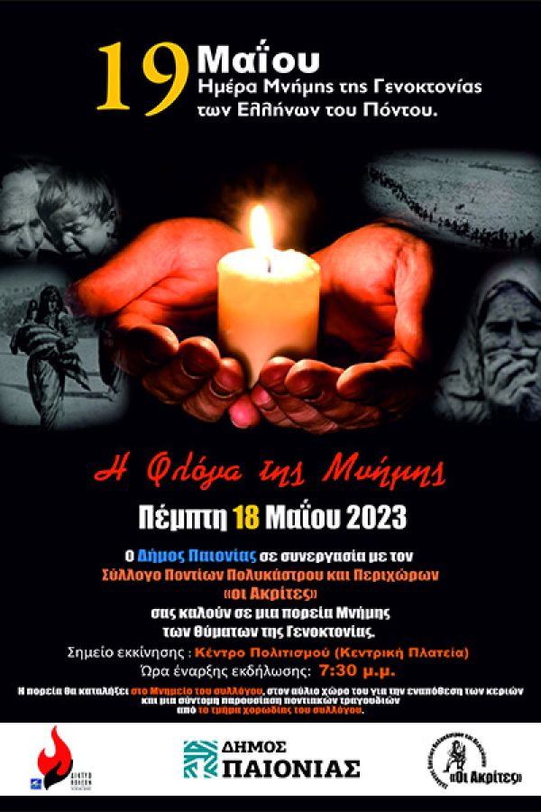 Την Πέμπτη 18 Μαϊου, ο Δήμος Παιονίας ως μέλος του Δικτύου Πόλεων με Κοινότητες Απογόνων Ελλήνων της Καθ' ημάς Ανατολής της Κεντρικής Ένωσης Δήμων Ελλάδος σε συνεργασία με τον Σύλλογο Ποντίων Πολυκάστρου & Περιχώρων "ΟΙ ΑΚΡΙΤΕΣ", σας καλούν σε μία πορεία μνήμης των θυμάτων της Γενοκτονίας.