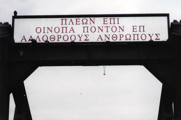 Όλοι οι περαστικοί θέλουν δεν θέλουν βλέπουν την τεράστια επιγραφή της γέφυρας που δεσπόζει κι από τις δύο πλευρές με κεφαλαία ελληνικά γράμματα και προσπαθούν να τη διαβάσουν. Στην επιγραφή είναι γραμμένο σε γλώσσα Ομήρου: ΠΛΕΩΝ ΕΠΙ ΟΙΝΟΠΑ ΠΟΝΤΟΝ ΕΠ ΑΛΛΟΘΡΟΟΥΣ ΑΝΘΡΩΠΟΥΣ (Πλέων επί οινόπα πόντον επ’ αλλθρόους ανθρώπους) που σε ελεύθερη μετάφραση θα πει: Πλέοντας σε βαθυκκόκινη θάλασσα προς αλλόγλωσσους ανθρώπους. Είναι σημαδιακό για την πόλη, αλλά και την Γερμανία όλη, αφού φιλοξενεί σήμερα όλες τις φυλές και τους λαούς της γης. Έτσι ένα μουντό πρωϊνό νάμαι και εγώ πάνω στη γέφυρα, ανάμεσα στους τουρίστες και όχι μόνο, οι οποίοι προσπαθούσαν να φωτογραφηθούν έχοντας στο κάδρο και την επιγραφή, την οποία δεν μπορούσαν να διαβάσουν αλλά ούτε φυσικά να κατανοήσουν. Εγώ βέβαια μπόρεσα να την διαβάσω όχι όμως και να την κατανοήσω, αυτό έγινε μετά. Δυστυχώς δεν υπάρχει πια ούτε η μετάφραση στα Γερμανικά, αφού ύστερα από εργασίες βαφής πριν μερικά χρόνια, δεν ξανατοποθετήθηκε η πινακίδα με την μετάφραση.