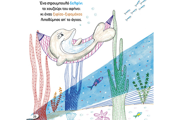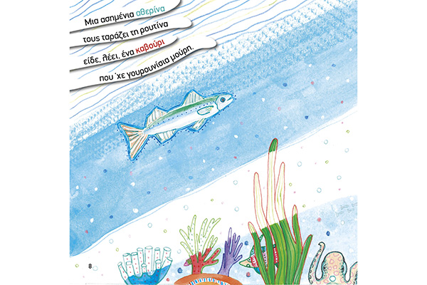 Μέσα από απροσδόκητες εικόνες τα παιδιά ανακαλύπτουν τον υποθαλάσσιο μαγικό κόσμο και γνωρίζουν, διασκεδάζοντας, τα πιο δημοφιλή είδη ψαριών και τα πιο παράξενα και μυστηριώδη πλάσματα του βυθού:ένα χταπόδι που σκεφτόταν σταυροπόδι, ένας ψηλομύτης γαύρος, ένα στρουμπουλό δελφίνι, ένας ξιφίας-ξιφομάχος, ένας φουξ-ροζ αστερίας, ένας σαργός πολύ αργός, ένα καλαμάρι βαμπίρ που έπινε λαίμαργα κεφίρ, ένα ηλεκτροφόρο χέλι που χορεύει τσιφτετέλι, ένα ψάρι καλλιτέχνης που ζωγραφίζει σαν Πικάσο, ένα…παπαγαλόψαρο, μια μυθική γοργόνα με την πράσινη ψαροουρά