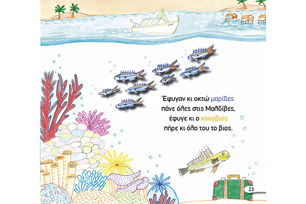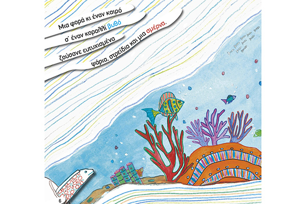 Ένα παραμύθι με παιγνιώδη ρίμα που διαδραματίζεται στον κοραλλί βυθό της θάλασσας. Ή μήπως όχι; Δύο παιδιά, μπροστά στο ενυδρείο του σπιτιού τους, ταξιδεύουν με τη φαντασία τους στον μαγικό κόσμο της θάλασσας και συλλαβή τη συλλαβή, σαν νότα με νότα, ταιριάζουν αυτήν την ιστορία που στο «παρά-πέντε» προφταίνει να ολοκληρωθεί, αφού ο πατέρας τους, τα επαναφέρει στην πραγματικότητα ,καλώντας τα σε «δείπνο και ύπνο».