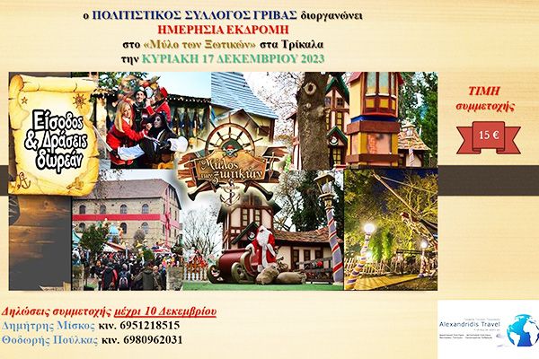 Αναχώρηση μπροστά από το Κέντρο Νεότητας στις 07:00 και με ενδιάμεσες στάσεις φθάνουμε στα Τρίκαλα, την πόλη που φιλοξενεί το μεγαλύτερο δωρεάν Χριστουγεννιάτικο θεματικό πάρκο της Ελλάδας. Ο Μύλος των Ξωτικών, από την πρώτη στιγμή και για 10 συνεχόμενα χρόνια, χάρισε εκατομμύρια χαμόγελα, με δωρεάν είσοδο, δωρεάν δράσεις και αμέτρητες εκπλήξεις. Ελεύθερος χρόνος στο πάρκο και αναχώρηση για το κέντρο της πόλης των Τρικάλων. Η πόλη των Τρικάλων με τον ποταμό Ληθαίο να τη διατρέχει, έχει μια ξεχωριστή ατμόσφαιρα και φιλοξενεί αρκετά αξιοθέατα και χώρους διασκέδασης και εστίασης. Παραμονή για γνωριμία με την όμορφη και άρτια οργανωμένη πόλη. Στη συνέχεια, θα πάρουμε το δρόμο της επιστροφής με τις καλύτερες εντυπώσεις.