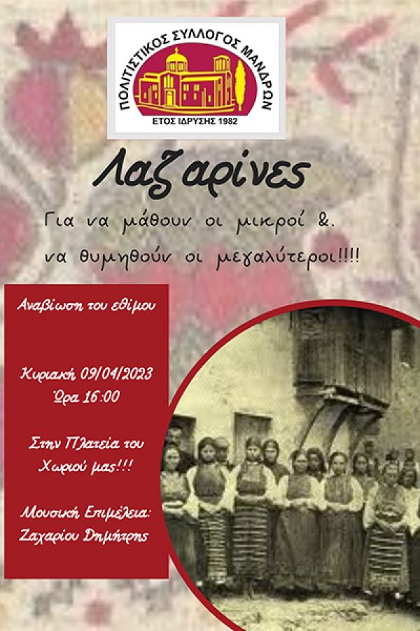 Οι Λαζαρίνες ή τα Κάλαντα του Λαζάρου είναι ένα έθιμο, προερχόμενο από από την αρχαία Ελλάδα με μεγάλη ιστορία στη Θράκη και τη Μακεδονία. Τα κάλαντα αυτά, τραγουδούν μόνο κορίτσια, οι λεγόμενες «Λαζαρίνες». Από την προηγούμενη μέρα έχουν μαζέψει λουλούδια και με αυτά έχουν στολίσει καλαθάκια. Με αυτά τα καλαθάκια γυρνούν από σπίτι σε σπίτι και τραγουδούν διάφορα τραγούδια.