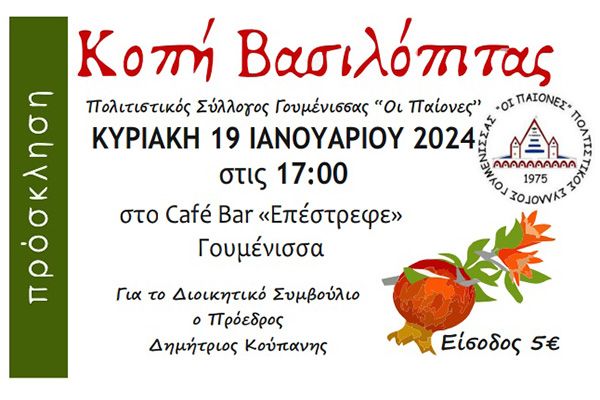 Ο Πολιτιστικός Σύλλογος Γουμένισσας «Οι ΠΑΙΟΝΕΣ» θα κόψει την βασιλόπιτά του την Κυριακή 16 Ιανουαρίου 2025, ώρα 17.οο, στο καφε μπαρ  «επέστρεφε» στη Γουμένισσα.