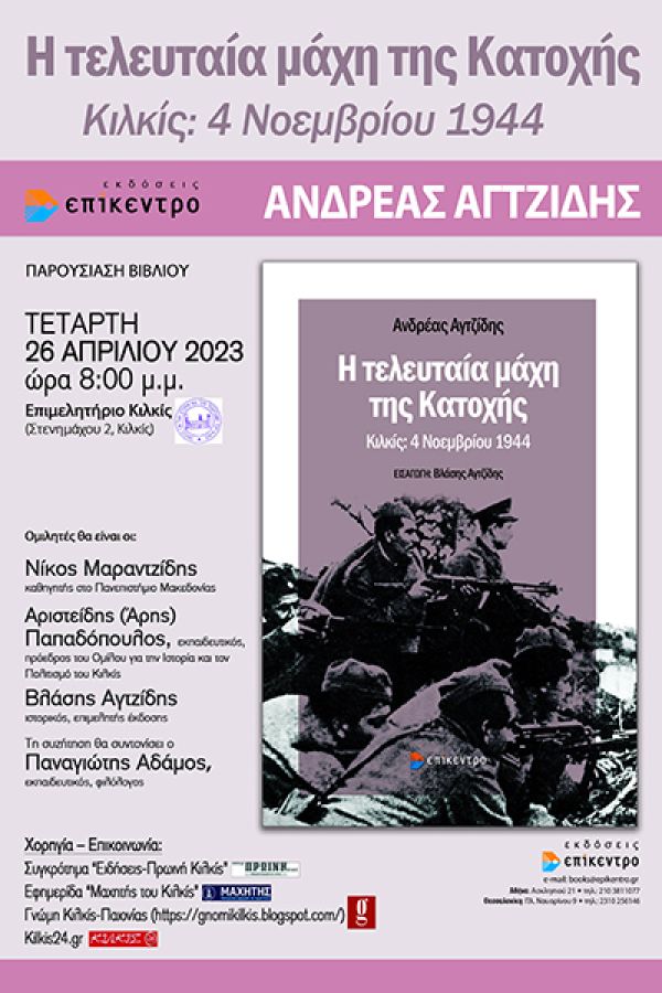 Ο Όμιλος για την Ιστορία και τον Πολιτισμό του Κιλκίς σας προσκαλεί στην παρουσίαση του βιβλίου του Ανδρέα Αγτζίδη: «Η τελευταία μάχη της Κατοχής. Κιλκίς: 4 Νοεμβρίου 1944»